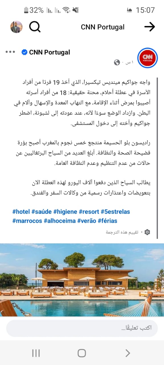 بحسب ما أوردته CNN البرتغالية، قام جواكيم مينديس تيكسيرا، وهو مواطن برتغالي، بدعوة 19 فردًا من عائلته لقضاء عطلة صيفية في منتجع “راديسون بلو” بالحسيمة. إلا أن هذه العطلة تحولت بسرعة إلى كابوس، حيث أصيب 18 من أفراد العائلة بأعراض مرضية خطيرة شملت التهاب المعدة، والإسهال، وآلامًا حادة في البطن. الوضع تفاقم بعد العودة إلى لشبونة، حيث اضطرت إحدى أفراد العائلة إلى دخول المستشفى لتلقي العلاج، وهو ما زاد من حجم الفضيحة.